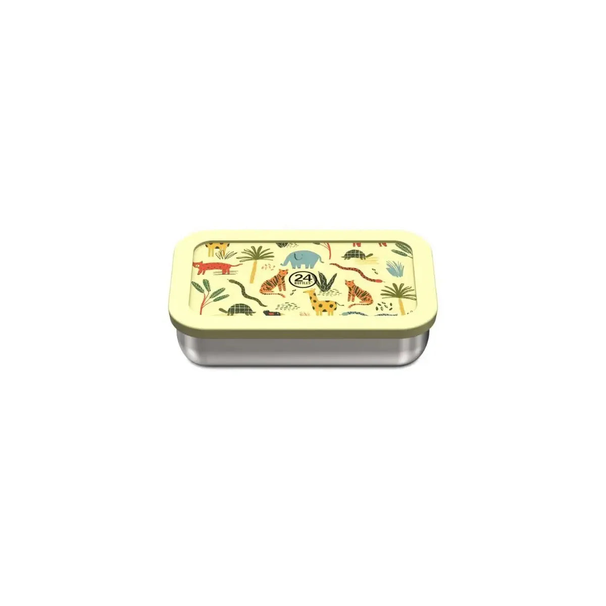 24Bottles Snack Box Jungle Friends i rustfritt stål, med fargerike jungeldyr på lokket – en praktisk og trygg matboks for både barn og voksne. Suztain.no