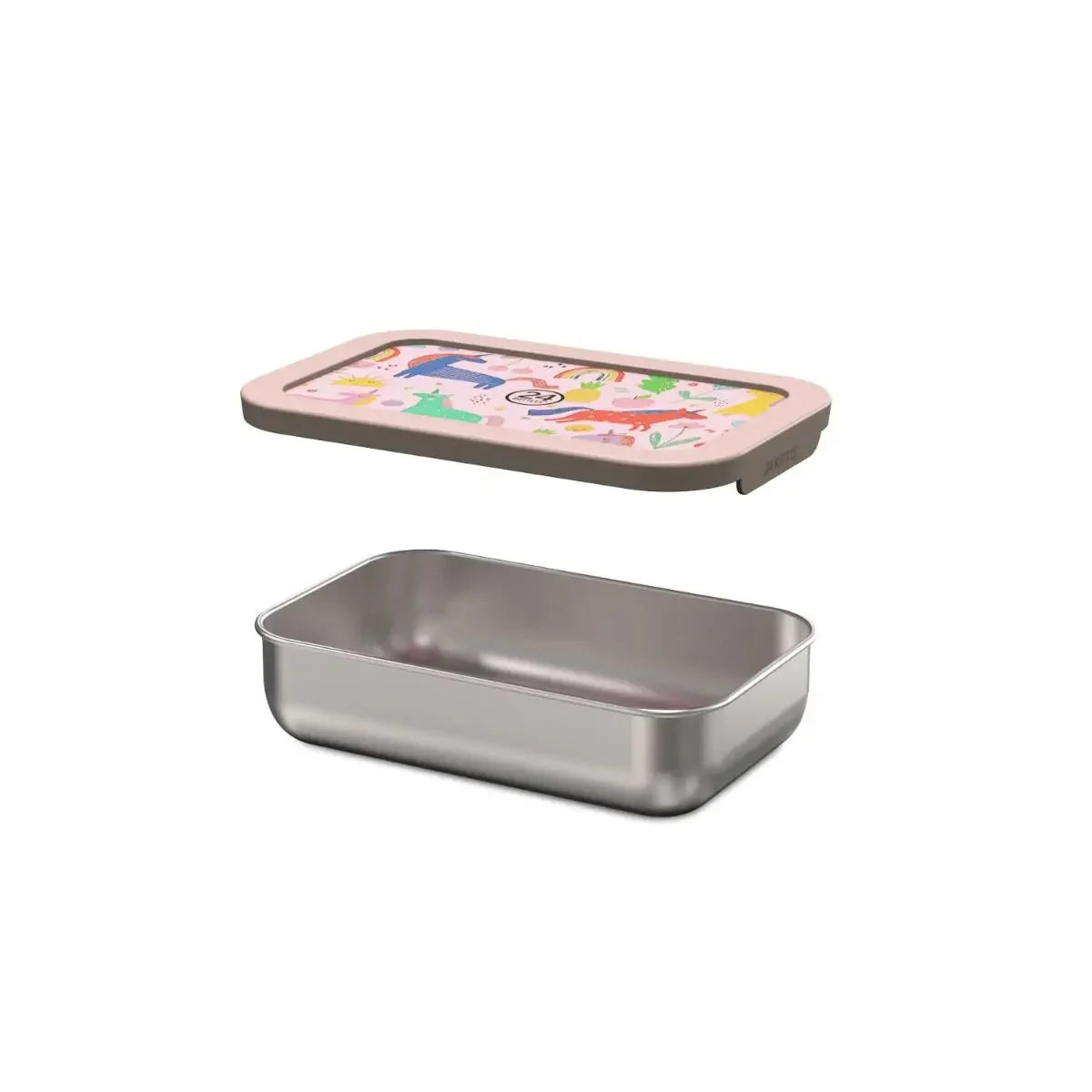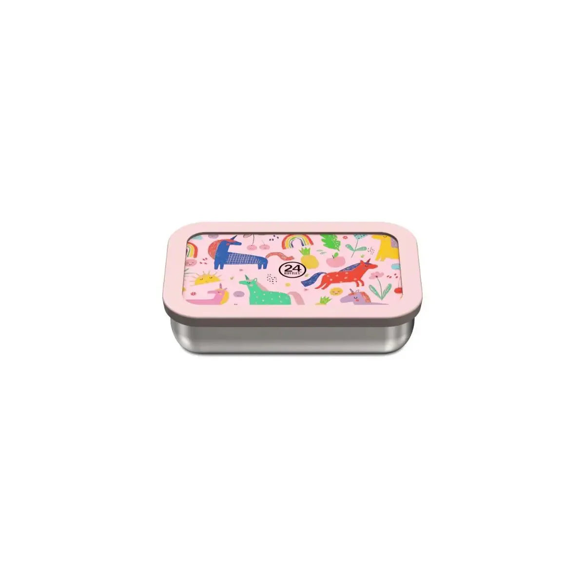 24Bottles Snack Box Magic Friends i rustfritt stål, i rosa med fargerike dyr på lokket – en praktisk og trygg matboks /snack boks for både barn og voksne. Suztain.no