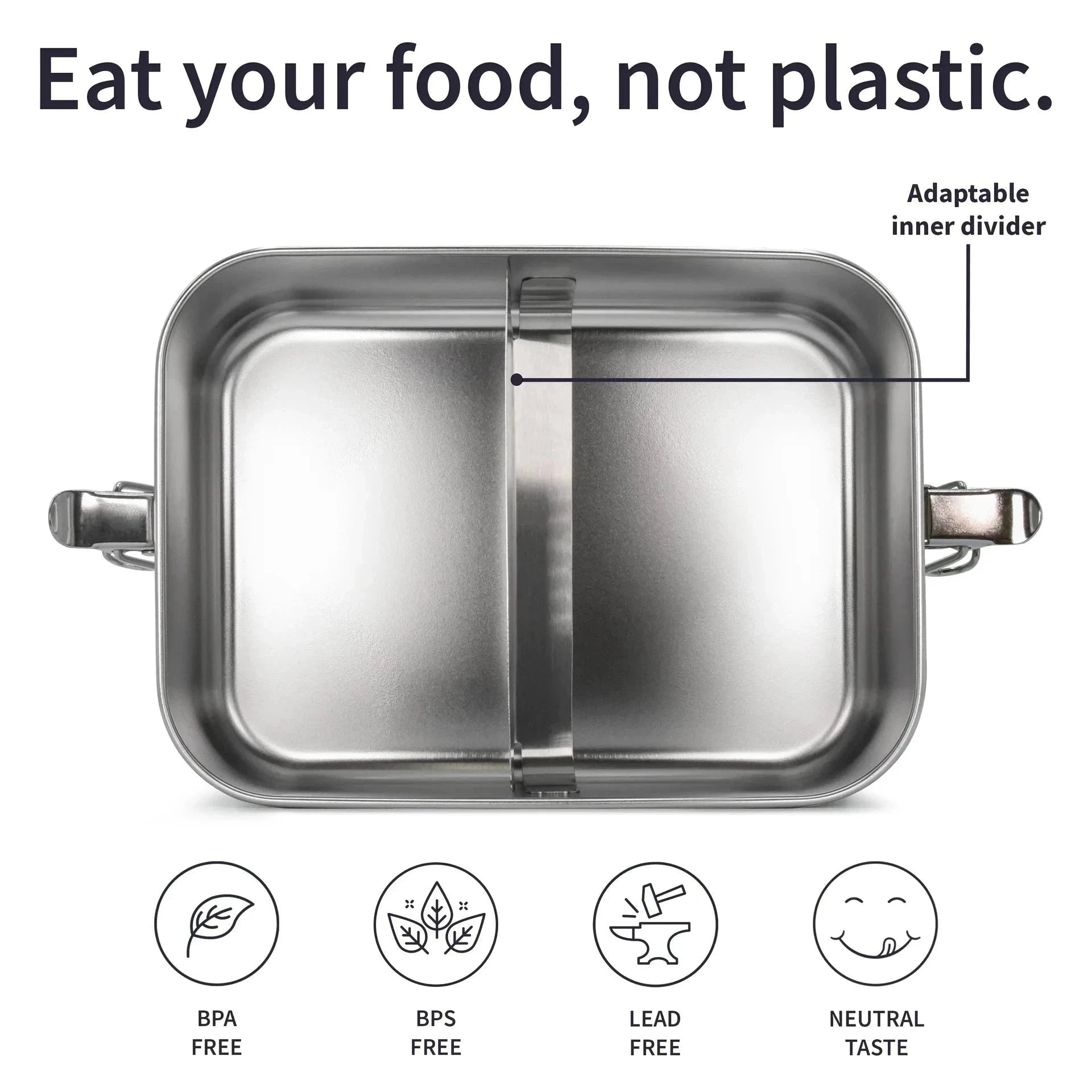 Denne matboksen i rustfritt stål er perfekt for frokost, lunsj og snacks på farten. Med to justerbare rom og BPA-fri silikonpakning i lokket får du en 100 % lekkasjesikker løsning som varer.