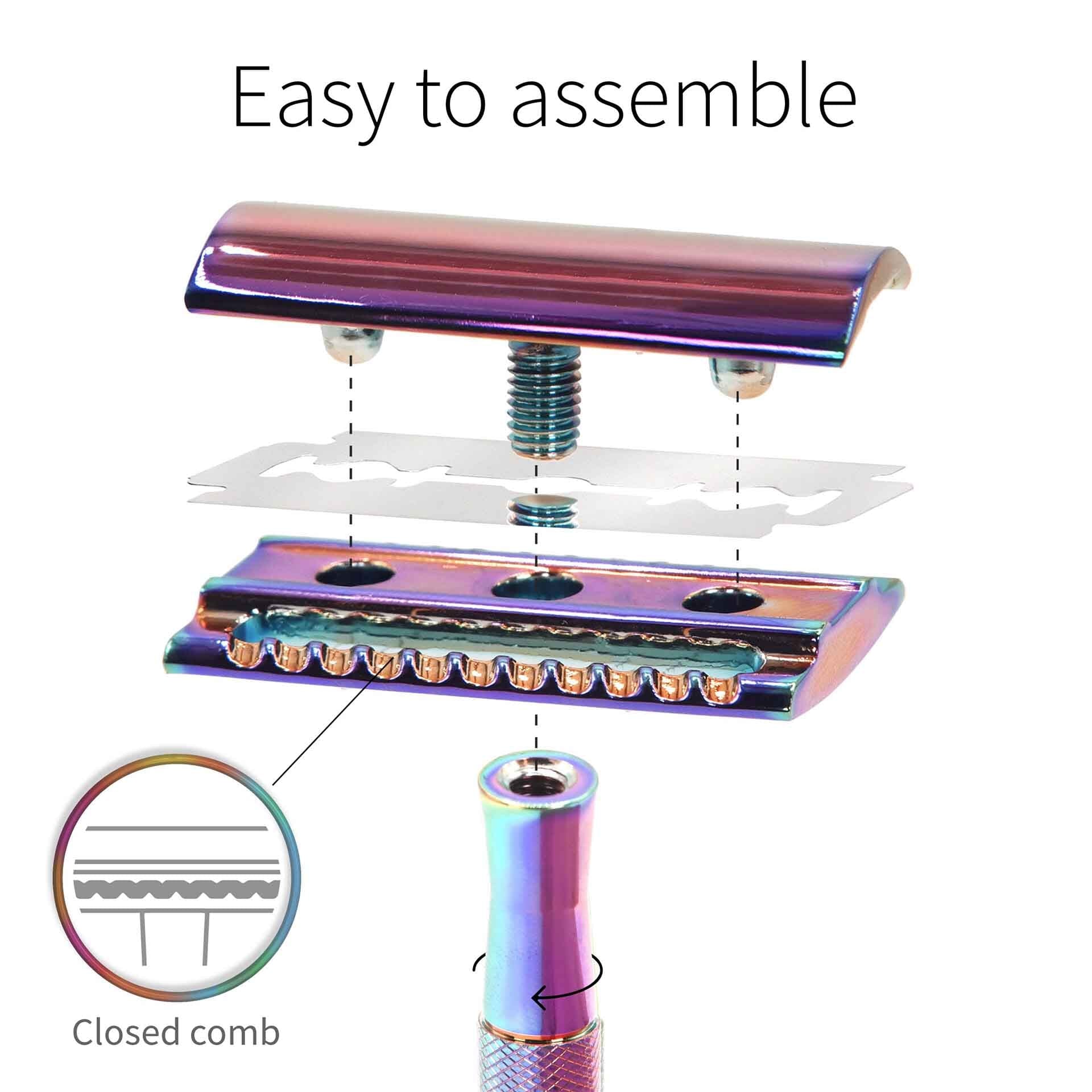 Rainbow-designet er ikke bare en fryd for øyet, det er også praktisk. Det riflede messinghåndtaket gir et sikkert grep, selv i dusjen, og den perfekte vekten hjelper deg med å få en presis barbering uten anstrengelse. Du trenger ikke legge unødvendig trykk – tyngden på høvelen gjør jobben for deg.