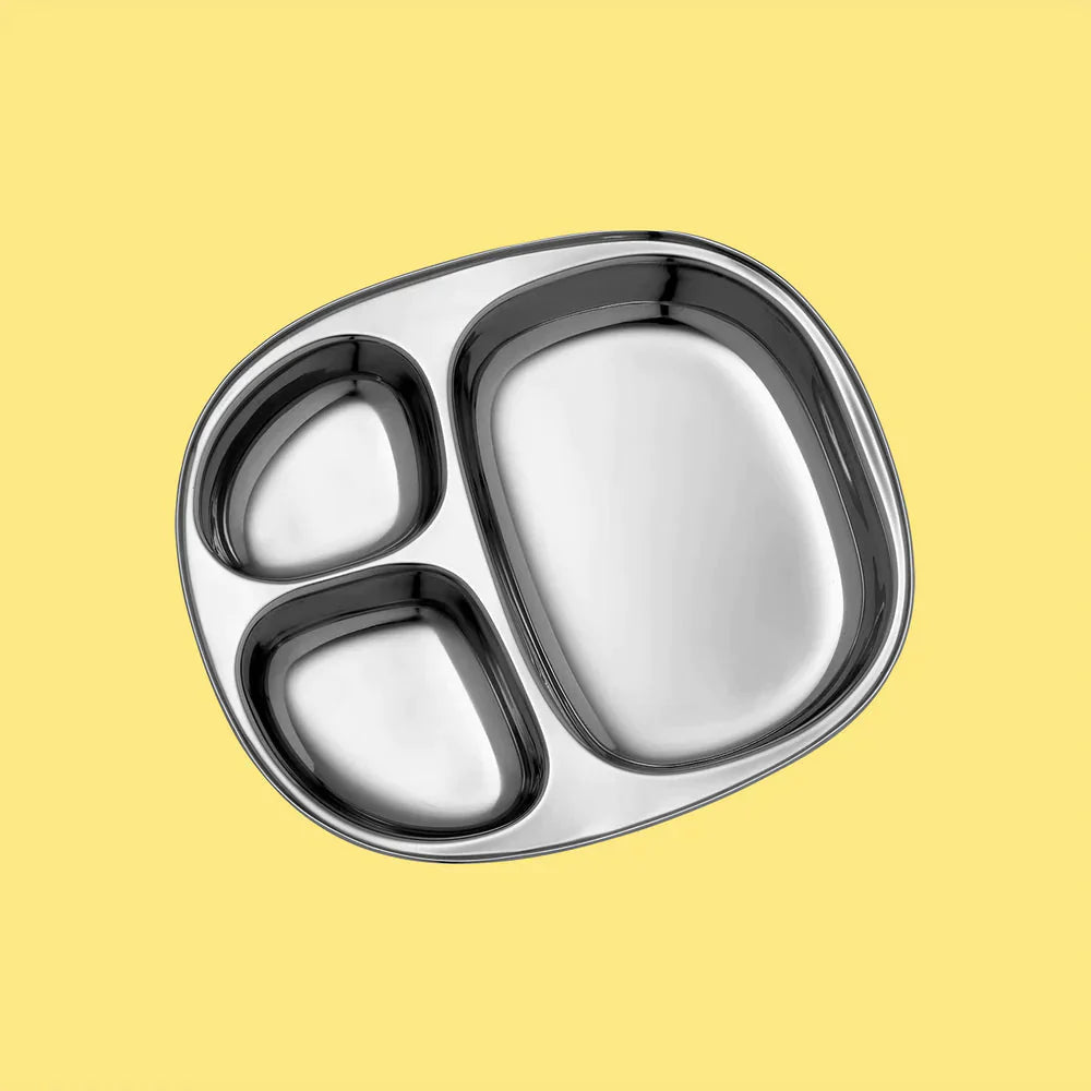 Gi små hender en praktisk og ryddig måltidsopplevelse med denne tallerkenen i matsikkert rustfritt stål. Den er delt inn i tre separate rom, perfekt for barn som foretrekker å holde maten adskilt. Ideell for både hverdag og eventyr – den er robust, tåler oppvaskmaskin og er et smart valg for campingturer og utflukter.