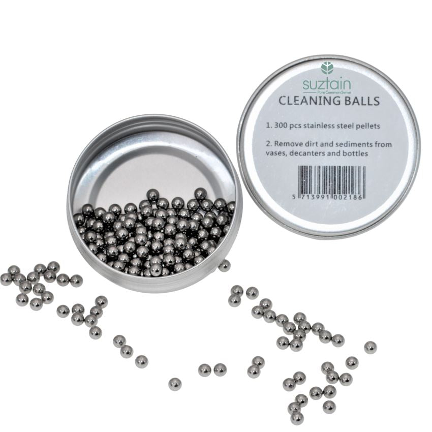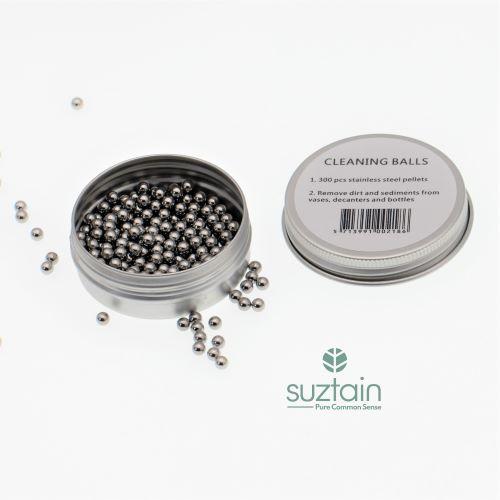 Vi kjenner alle de irriterende flaskene, karaflene eller vasene som er umulige å rengjøre med en flaskebørste. Her kommer Suztain Rensekuler i rustfritt stål inn som redningen! Med 300 små kuler og litt vann får du fjernet alt fra vin- og kaffeflekker til alger og kalk.