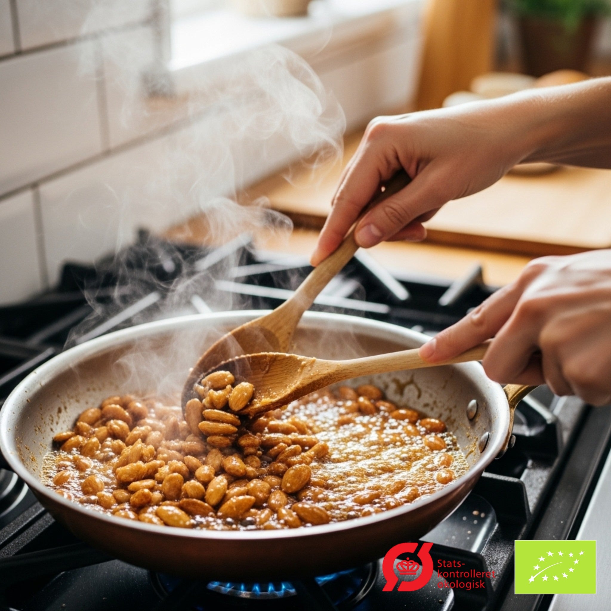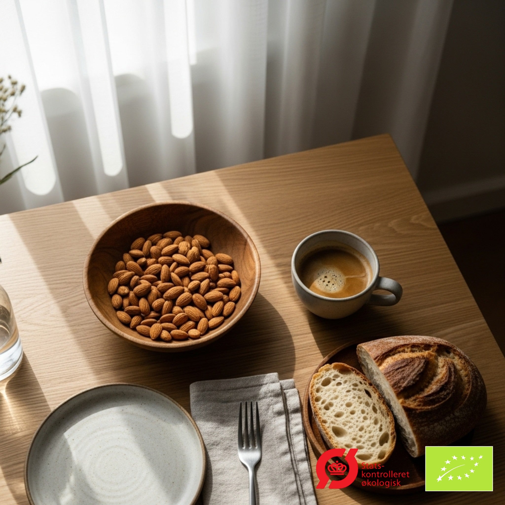Ja, mandlene er sertifisert økologiske under DK-ØKO-100 og merket med EU-økologimerke.