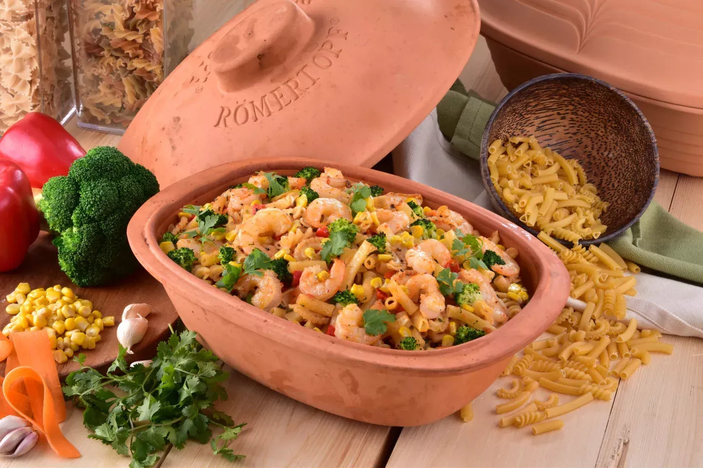 Römertopf Trend Roaster bringer tilbake den eldgamle dampkoketeknikken i en moderne innpakning. Laget av naturlig, porøs leire, gir denne gryten skånsom varme og optimal fordeling – slik at ingredienser med ulik steketid er klare samtidig. Perfekt for travle hverdager og rolige helgemiddager.
