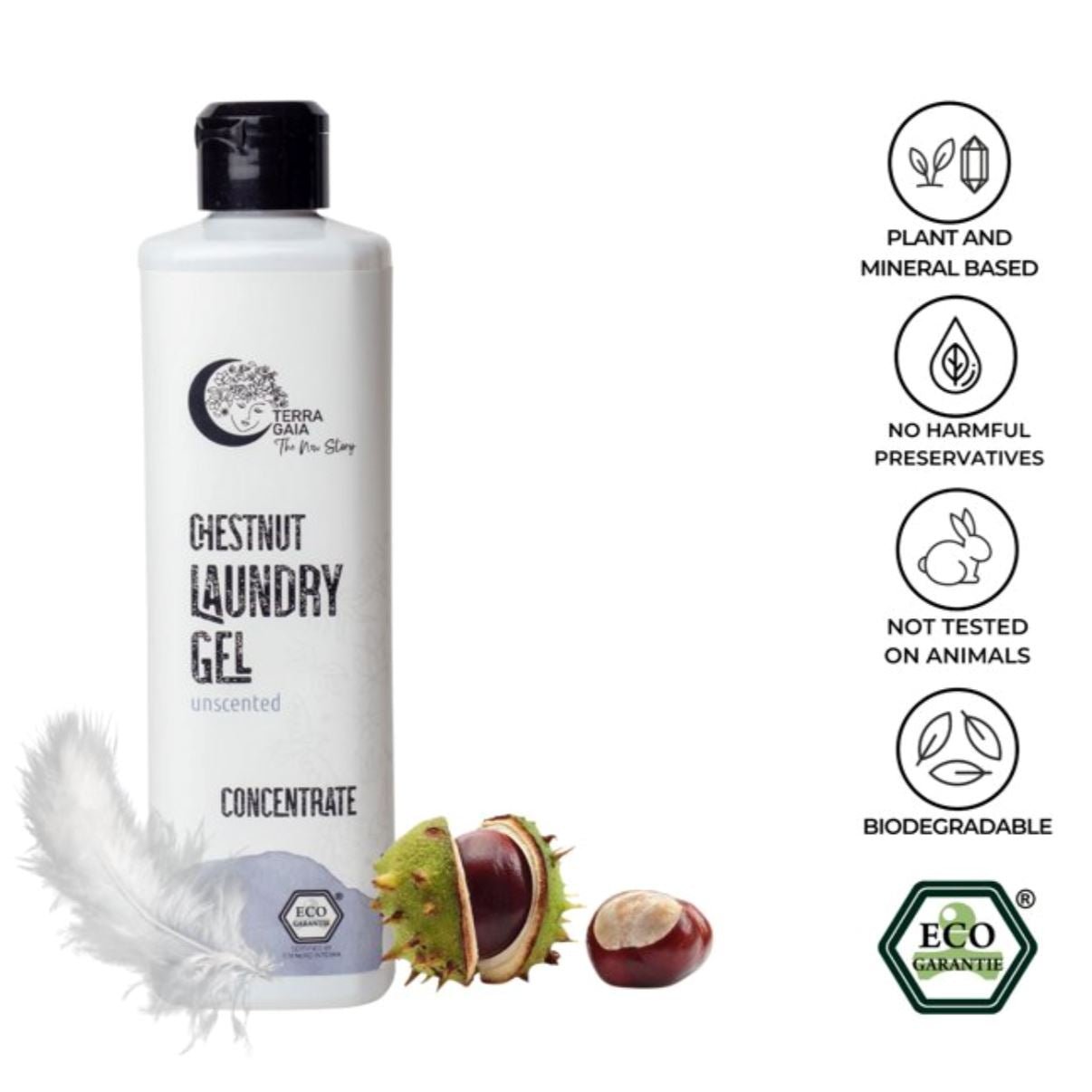 Organic Detergent Gel fra Terra Gaia er en veldig konsentrert og likevel veldig skånsom og miljøvennlig gel som er ideell for vask av fargede klær. Vaskemidlet er basert på økologisk hestekastanjeekstrakt. Det perfekte valget for delikat vask, barneklær og tøybleier.