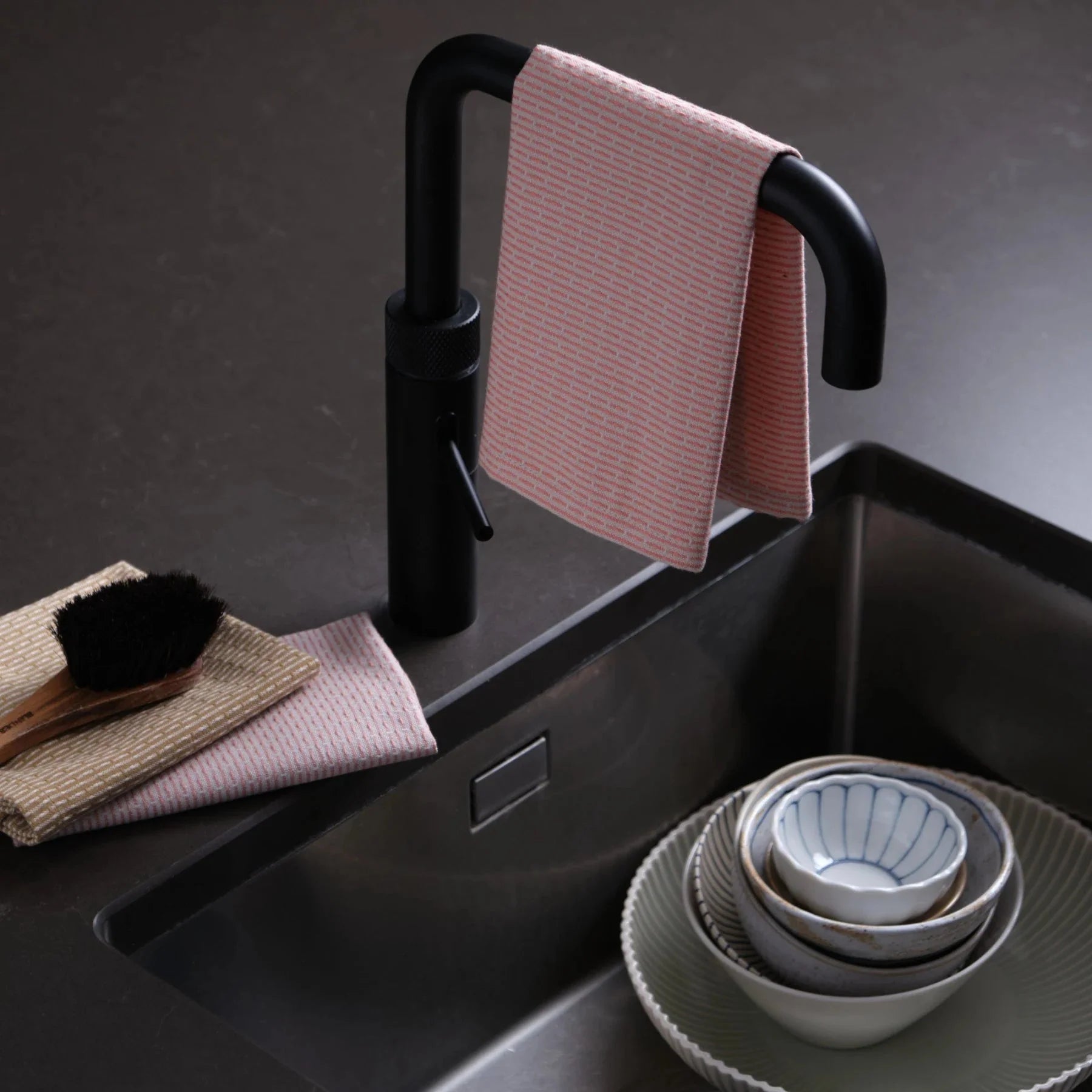 Kjøkkenkluten er vevd i en egen piqué-struktur utviklet av vevdesigneren Laura Ruscillo. Den minimalistiske utformingen gjør at den passer inn i både moderne og klassiske kjøkken.