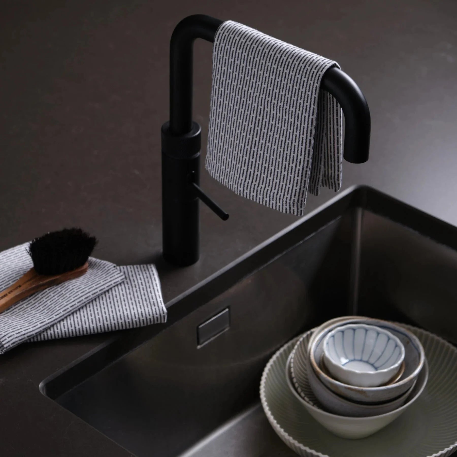 Kjøkkenkluten er vevd i en egen piqué-struktur utviklet av vevdesigneren Laura Ruscillo. Den minimalistiske utformingen gjør at den passer inn i både moderne og klassiske kjøkken.