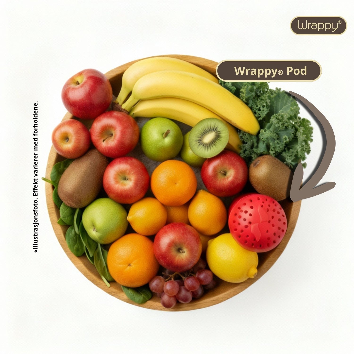 Frukt og grønt slipper ut etylengass når de modnes(modningsgass). Wrappy® Pod absorberer modningsgassen i fruktskålen og i kjøleskapet, slik at modningen går saktere og kvaliteten holder lenger. Resultatet er mindre matsvinn og lavere matbudsjett – helt uten spray, strøm eller styr.
